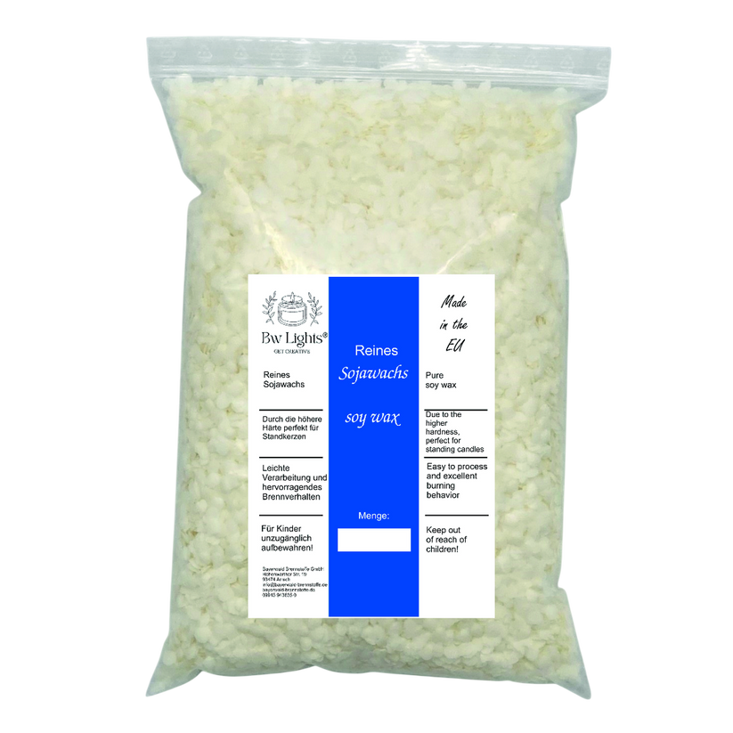 Unser Sojawachs ist speziell für Standkerzen entwickelt worden, es schrumpft mehr als weichere Wachse und lässt sich deshalb hervorragend aus der Form entfernen. Das Wachs wird aus Sojabohnen gewonnen die in Europa gewachsen und verarbeitet wurden. Es werden somit keine Flächen in Südamerika benötigt. Es ist vegan und frei von Tierversuchen. Das Sojawachs eignet sich hervorragend wegen der guten Duftaufnahme zur Herstellung von Duftkerzen.